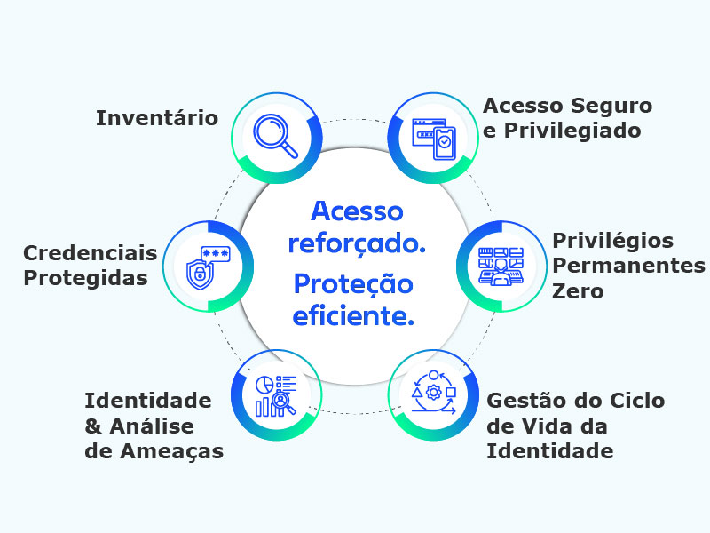 O privilégio zero permanente garante controlo de acesso just-in-time, limitando permissões apenas ao que é necessário, quando necessário. A governança de identidade abrangente e gestão do ciclo de vida proporcionam supervisão contínua através da aplicação automatizada de políticas e auditoria de segurança detalhada.
